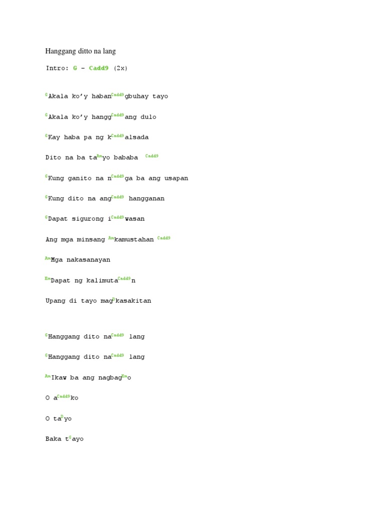 Hanggang dito na lang bababa lyrics. Intro G - C 2x G C Akala koy habangbuhay tayo G C Akala koy hanggang dulo G C Kay haba pa ng kalsada Am C Dito na ba tayo bababa G C Kung ganito na nga ba ang usapan G C Kung dito na ang hangganan G C Dapat sigurong iwasan Am C Ang mga minsang kamustahan Am Mga nakasanayan Em C Dapat ng kalimutan D Upang di tayo magkasakitan Chorus G C. Hanggang Dito Na Lang. Dito na ba tayo bababa.